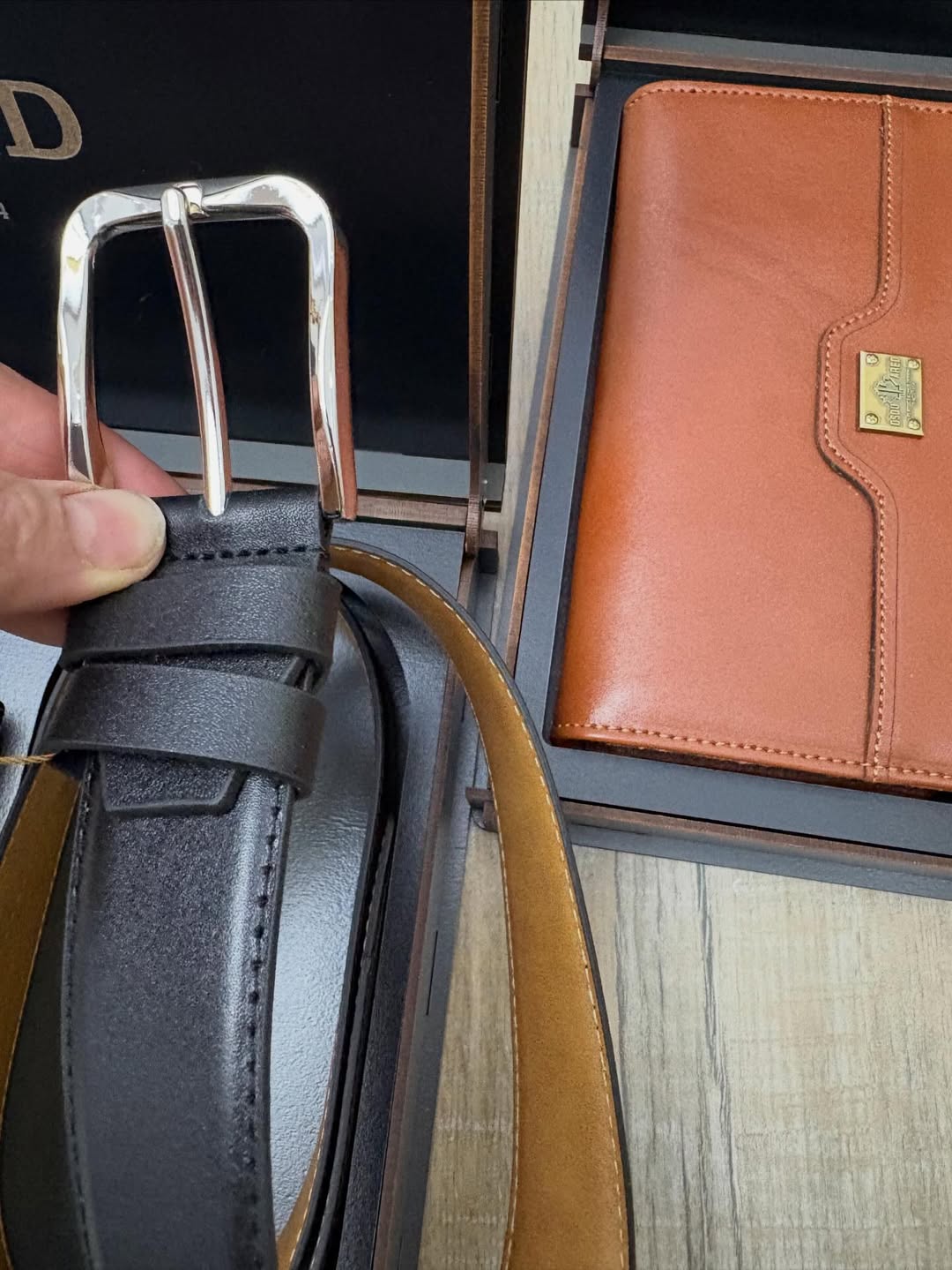 ست های چرمی مردانه با رنگ عسلی و مشکی. چرم طبیعی گاوی با جعبه قفل دار چوبی، یک هدیه خاص و جذاب.